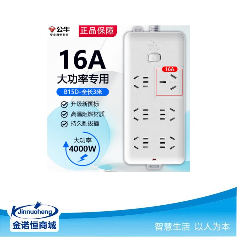 公牛(BULL)公牛16A插座空调热水器专用4000W大功率插排插板 拖接线板 6插位全长3米 GN-B15D